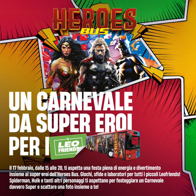 Il 17 febbraio, dalle 15 alle 20, arriva l’Heroes Bus con una straordinaria festa dedicata ai più piccoli: giochi, sfide e laboratori insieme a Spiderman, Hulk e tanti altri supereroi.
